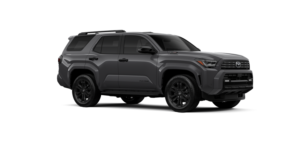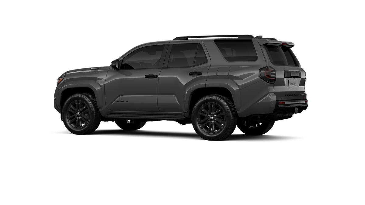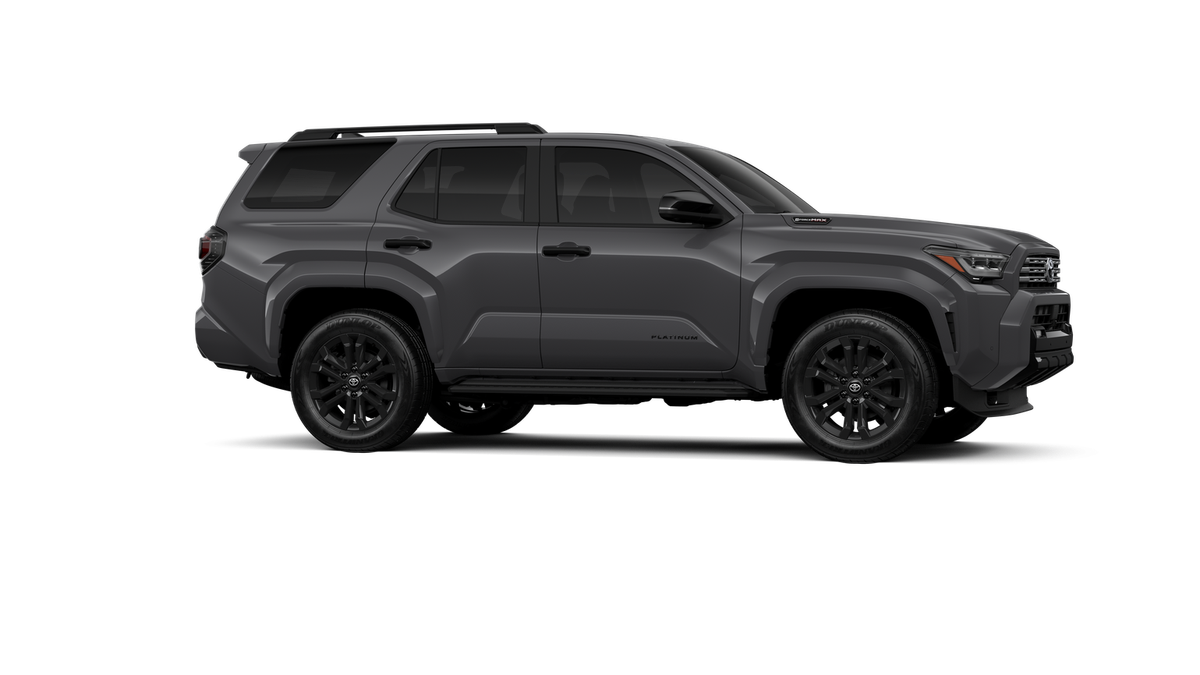 - Dark-chrome tri-bar grille; gloss-black mirror caps and door handles; color-keyed overfenders and rear spoiler; gloss-black "PLATINUM" and "4RUNNER" badges