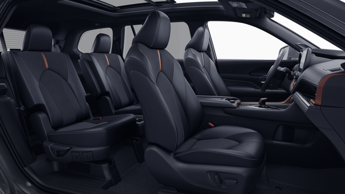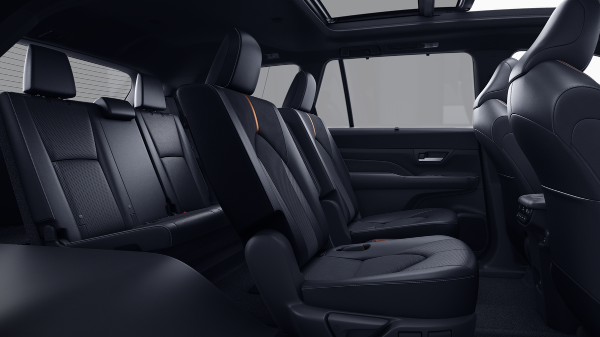 • 7-passenger seating with second-row fold-down captain's chairs and fold-down inboard armrests, adjustable headrests and two cup holders mounted on the floor; and 60/40 split, fold-down third-row seats with sliding headrests and recline function