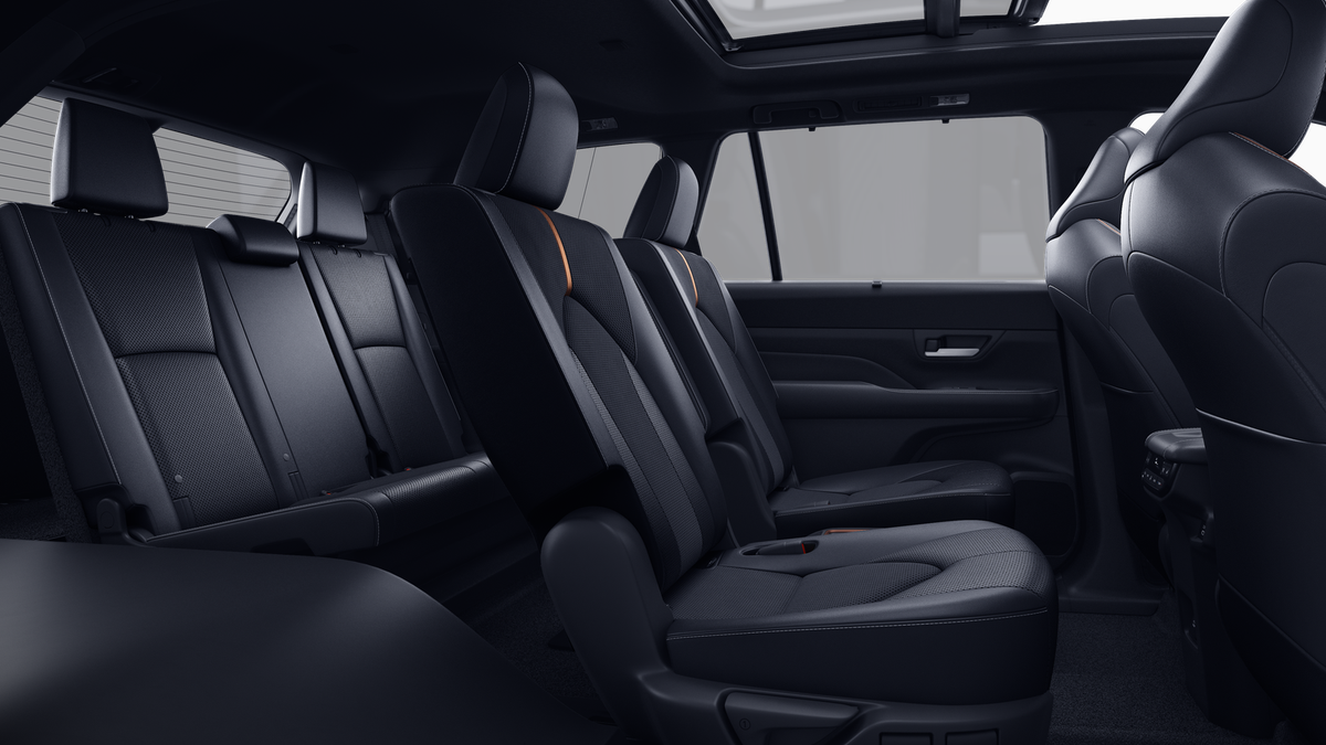 • 7-passenger seating with second-row fold-down captain's chairs and fold-down inboard armrests, adjustable headrests and two cup holders mounted on the floor; and 60/40 split, fold-down third-row seats with sliding headrests and recline function