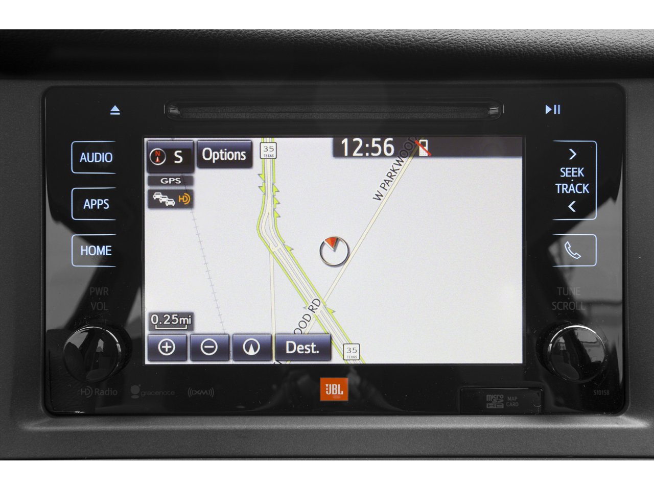 - Radio: JBL AM/FM/HD/CD w/10 Speakers -inc: navigation, Entune Multimedia Bundle, 7" high resolution touch-screen w/split-screen display, MP3/WMA playback capability, subwoofer, auxiliary audio jack, USB 2.0 port w/iPod connectivity and control, advanced voice recognition, hands-free phone capability, phone book access, music streaming via Bluetooth® wireless technology, Entune App Suite, HD predictive traffic and Doppler weather overlay, AM/FM cache radio, SiriusXM Radio w/3-month complimentary trial, Gracenotes album cover art and integrated backup camera display w/two views and on-screen backup guides